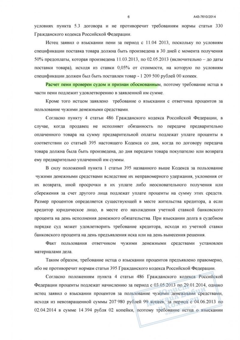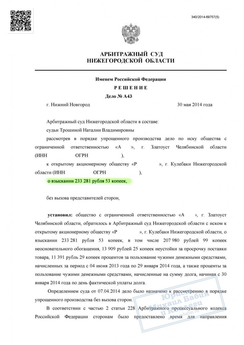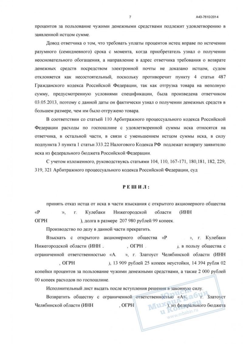 В результате умелых действий нашего адвоката «Р» был вынужден не только вернуть покупателю долг, но также выплатить неустойку за просрочку поставки, штраф за пользование чужими денежными средствами и взять на себя судебные расходы.