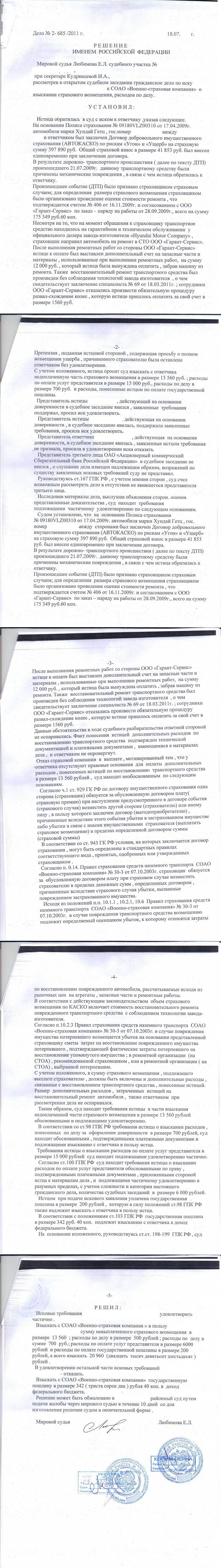 Ремонтные работы были выполнены ООО «Гарант-Сервис», после чего истице был предъявлен дополнительный счет на запасные части и материалы. Истица вынуждена была оплатить выставленную сумму. После этого она подала претензию страховой компании о полном возмещении ущерба, которая осталась без удовлетворения.