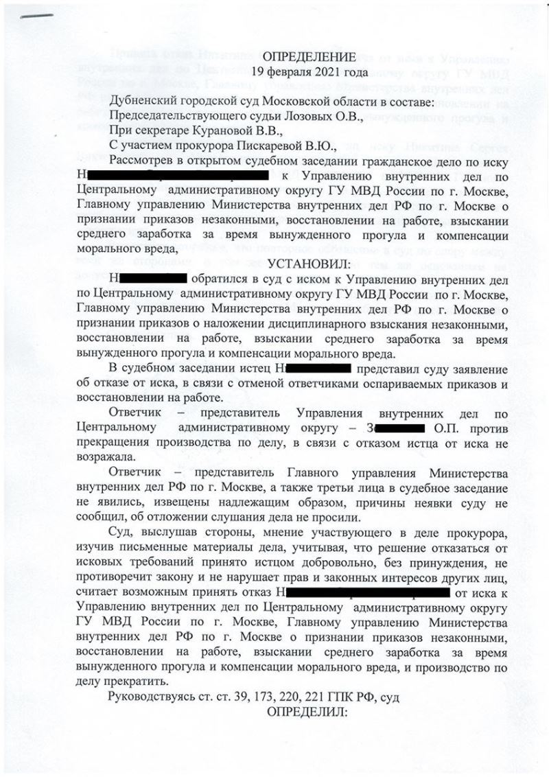 Адвокат изучил материалы служебной проверки и приказ об увольнении, после чего подготовил и подал исковое заявление в суд, принял участие в судебном разбирательстве.