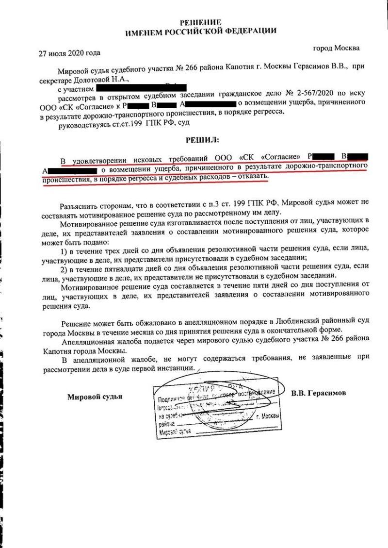 Защищены права клиента по регрессному иску страховой компании