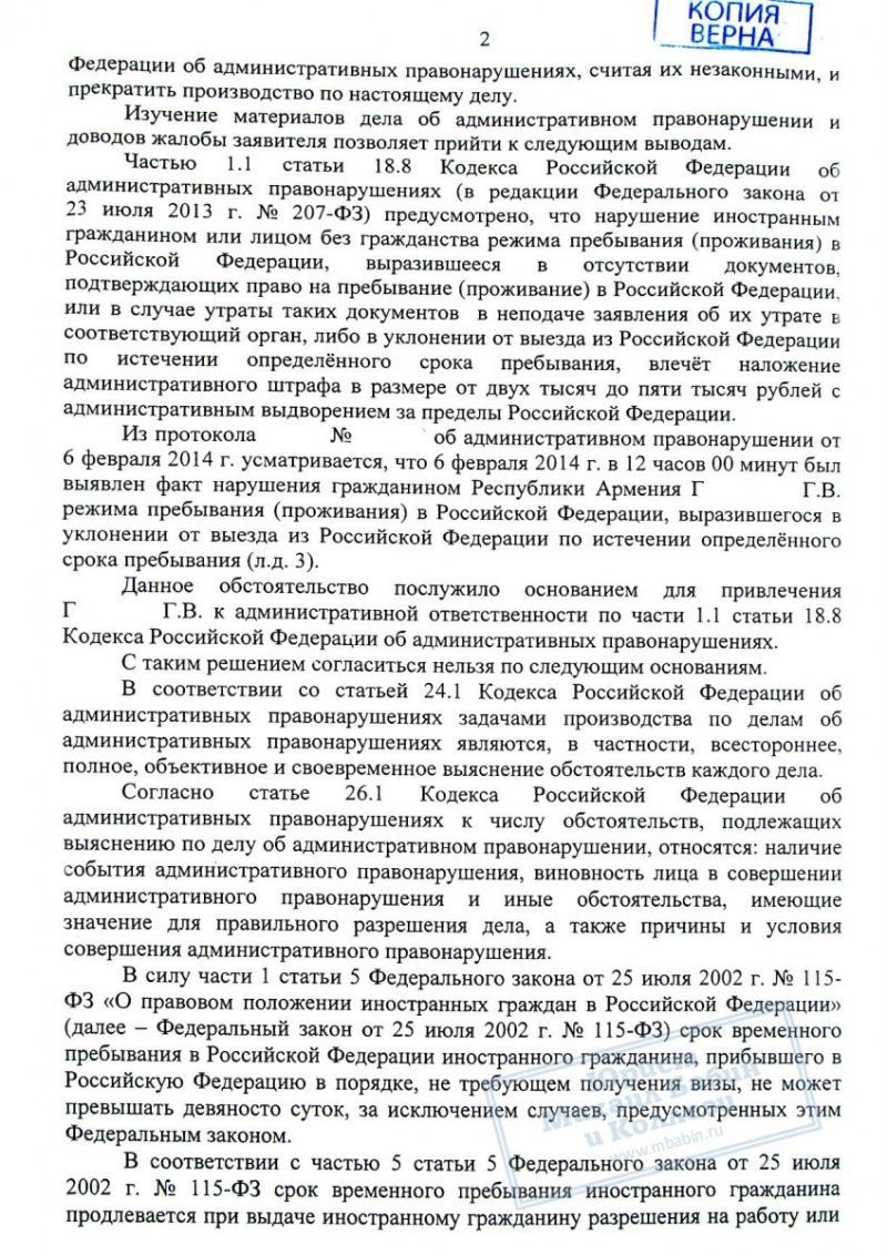 Гражданин Армении Г. был обвинен в административном правонарушении (уклонении от выезда из РФ) и приговорен к штрафу и выдворению с территории России. Несмотря на 2 проигранных суда Г. продолжил отстаивать свои права и обратился за помощью в нашу коллегию.