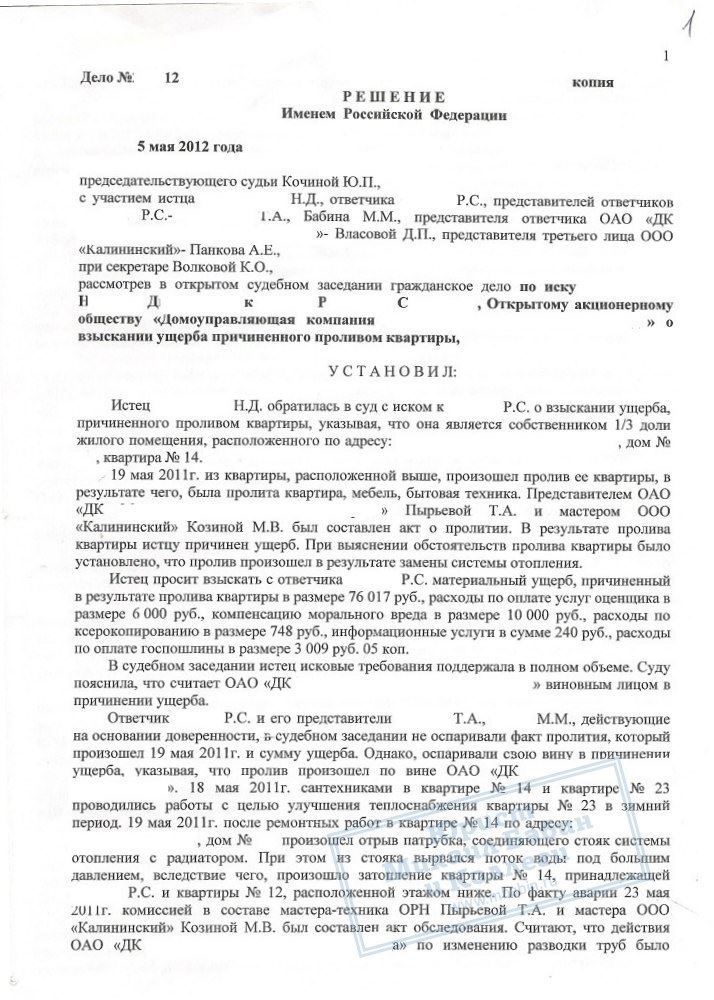 Руководитель нашей компании представлял интересы ответчика – Р.С., проживающего в квартире над истицей. Исковые требования состояли в выплате материального ущерба 76.017 руб., морального ущерба 10.000 рублей, а также в возмещении всех сопутствующих расходов (всего чуть менее 100 000 рублей).