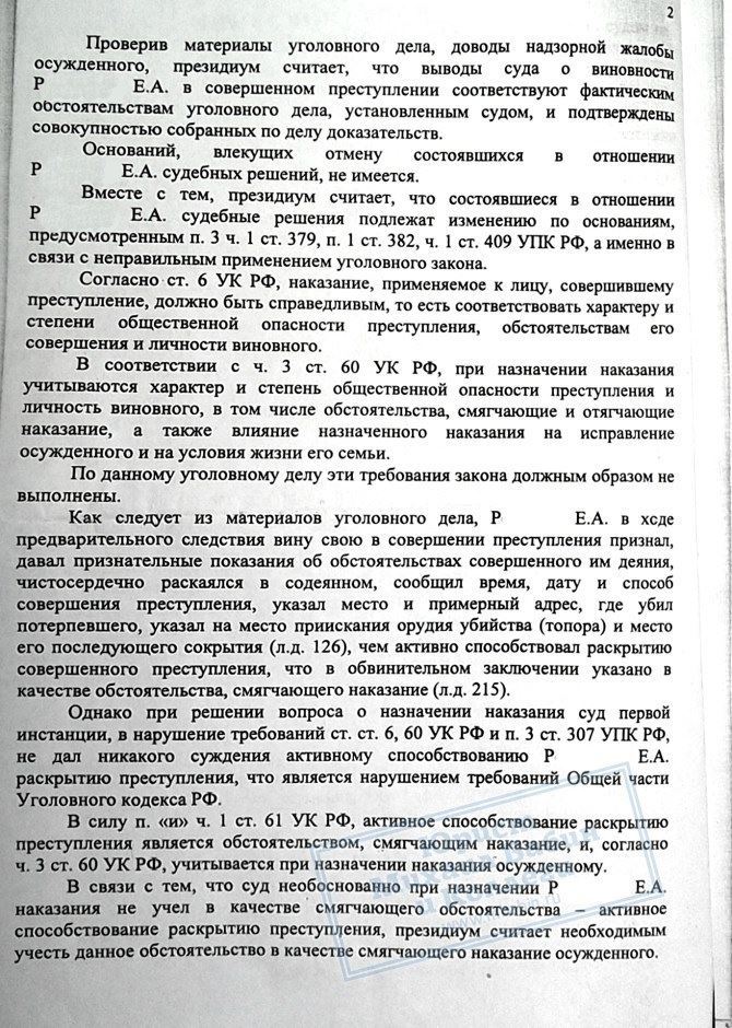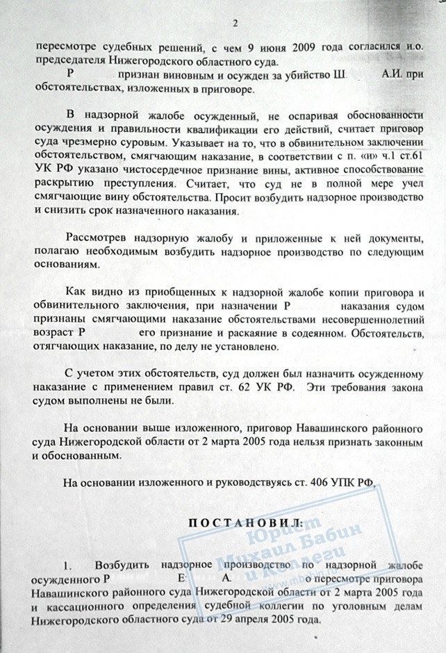 Р. был признан виновным в совершении преступления и осужден по ст. 105 УК РФ к лишению свободы сроком на 9 лет. Осужденный уже отбывал наказание более 6 лет, когда обратился за помощью к нашему адвокату. Адвокат подал в Верховный Суд РФ надзорную жалобу о пересмотре приговора в связи с неучтенными ранее смягчающими обстоятельствами.