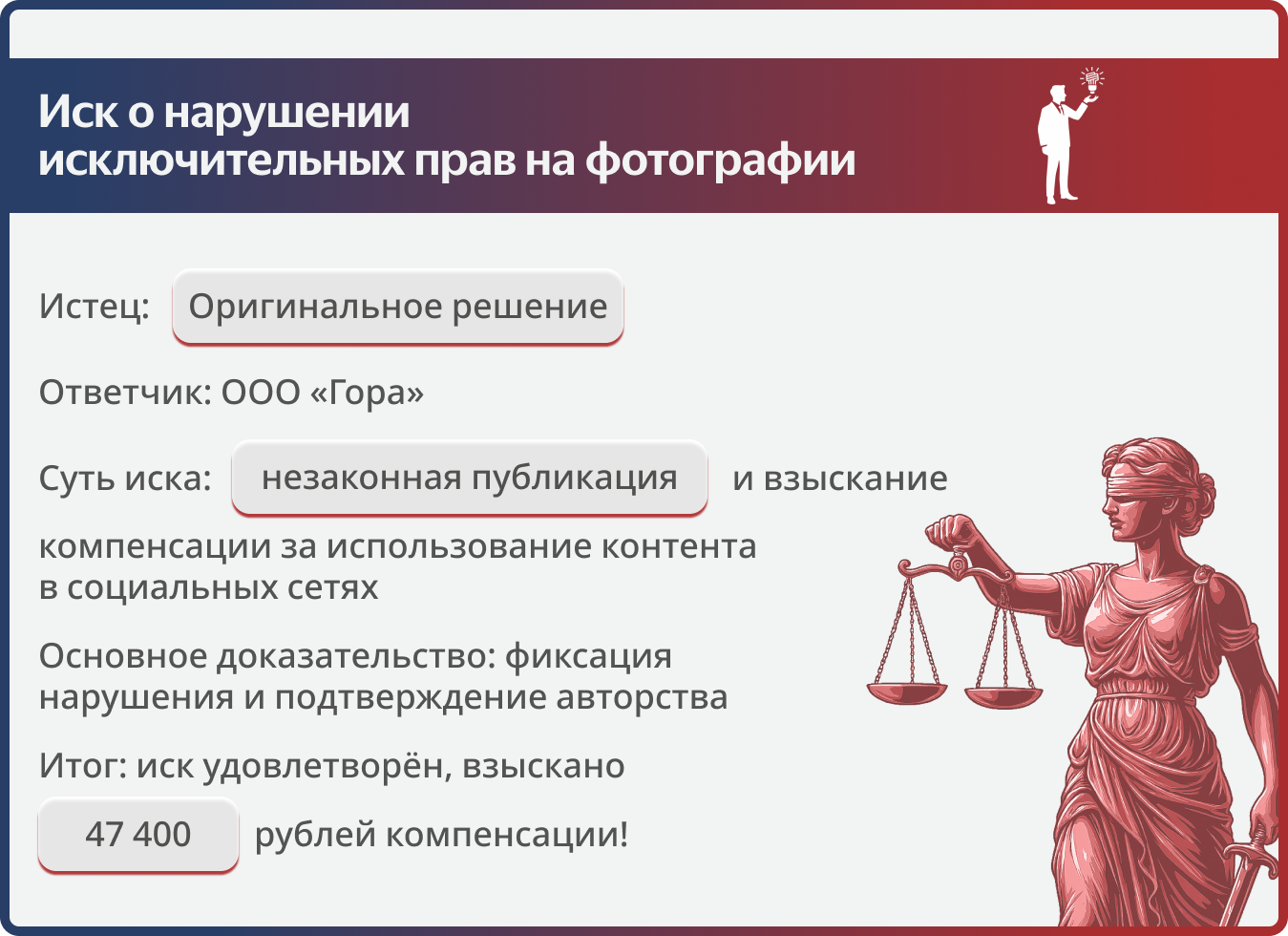 Юристы «Оригинального решения» умеют эффективно защищать творческий труд. Мы не просто фиксируем нарушение, а формируем доказательную базу (включая работу с RAW-файлами и метаданными), которая не оставляет оппонентам шансов на необоснованное снижение суммы иска.