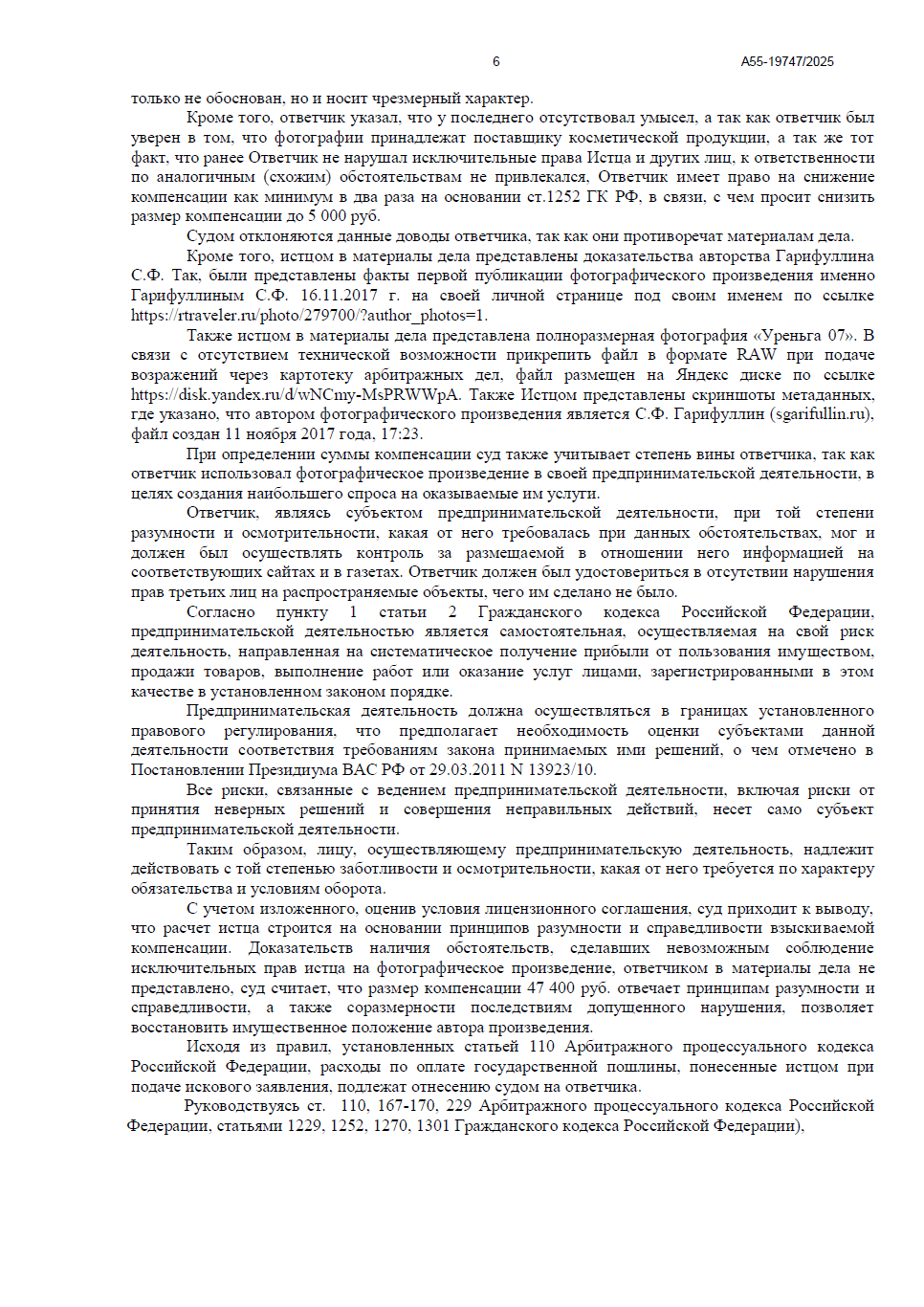 • Техническое подтверждение авторства: суду был представлен полноразмерный файл в формате RAW и скриншоты метаданных, подтверждающие создание фото именно Гарифуллиным в 2017 году.