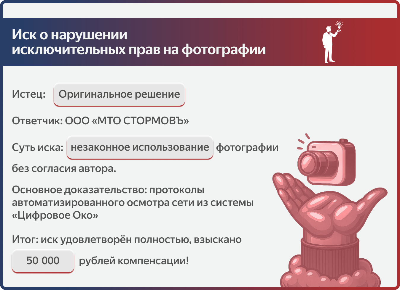 Ответчик использовал чужую фотографию, ссылаясь на то, что нашел её в интернете без указания автора. В суде нарушитель пытался доказать, что это «другой снимок», и оспаривал право нашей компании на подачу иска. Суд полностью поддержал нашу позицию, подтвердив эффективность защиты прав через договор доверительного управления.