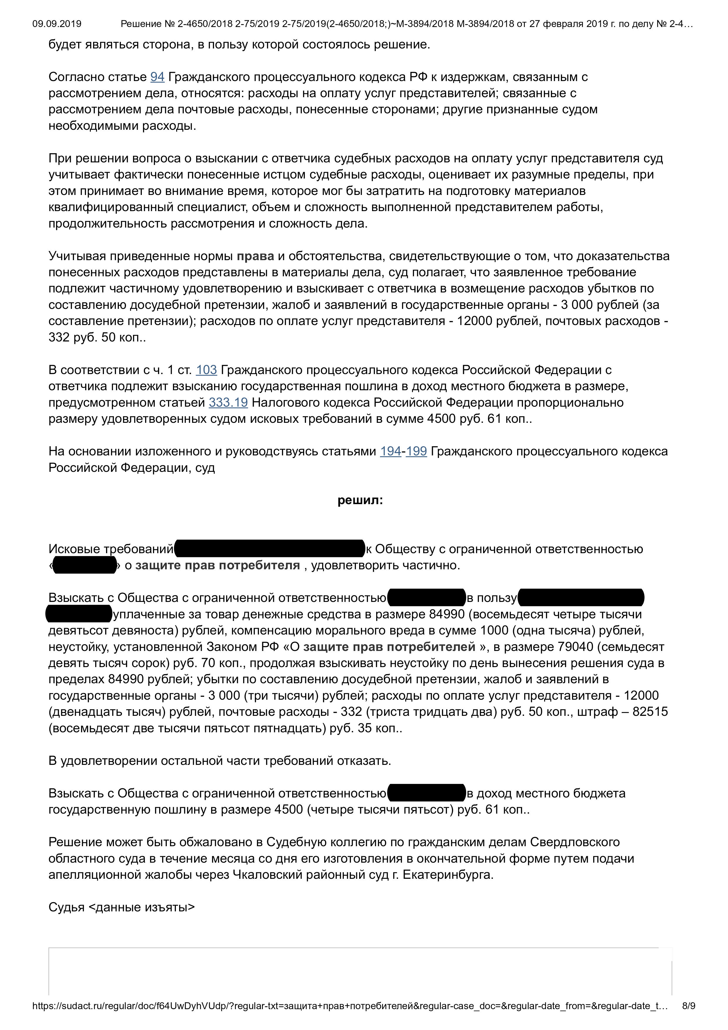 В итоге, в пользу нашей клиентки была взыскана стоимость телевизора, компенсация морального вреда, неустойка, расходы по составлению досудебной претензии, жалоб и заявлений, оплате услуг представителя, почтовые расходы, а также сумма штрафа.