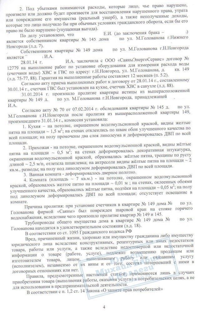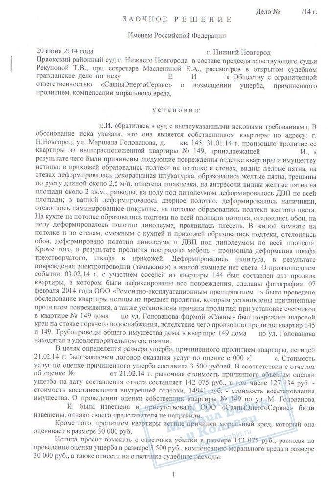 В результате деньги были взысканы с коммунальщиков, причём в сумме более 220 000 рублей, что в 2 раза превышает стоимость ремонта. Таким образом, Е.И. возмещены все неудобства, связанные с проливом квартиры, включая моральный вред.